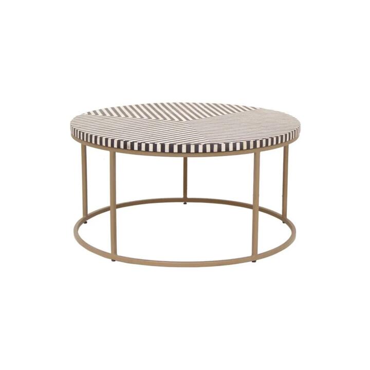 This coffee table has a refined, minimalist silhouette and is made with a centuries-old art form – bone inlay. It is handcrafted with ethically-sourced bone and has a monochrome hue. The brass coated iron base makes it a modern classic. Note:- Actual product colours may vary due to lighting, studio photography, room conditions, different screens on various devices. – All our furniture product are flat pack (assembly required) for safe handling purposes.