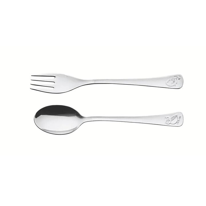 To encourage children's autonomy and to make mealtimes more fun, Tramontina's 2-piece stainless steel children's flatware set with glossy finish and relief pattern from the Baby Friends children's line is the best choice. The pieces have assorted relief engravings, and each piece is different. The perfect choice for mums and dads looking for convenient, high-quality products for their little ones. These highly resistant flatware pieces are entirely made of stainless steel, which does not release any particles into the food, thereby keeping it healthy. The pieces have an ergonomic shape that allows children to use them easily. They can be washed in the dishwasher daily. Features • Dishwasher Safe • Shiny Finish • Stainless Steel • Ergonomic • Highly Durable What Am I Buying• 1 x Fork • 1 x Spoon Materials Stainless Steel