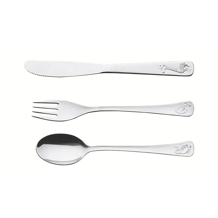 To encourage children's autonomy and to make mealtimes more fun, Tramontina's 3-piece stainless steel children's flatware set with glossy finish and relief pattern from the Baby Friends children's line is the best choice. The pieces have assorted relief engravings, and each piece is different. The perfect choice for mums and dads looking for convenient, high-quality products for their little ones. These highly resistant flatware pieces are entirely made of stainless steel, which does not release any particles into the food, thereby keeping it healthy. The pieces have an ergonomic shape that allows children to use them easily. They can be washed in the dishwasher daily. Features • Dishwasher Safe • Shiny Finish • Stainless Steel • Ergonomic • Highly Durable What Am I Buying• 1 x Knife • 1 x Fork • 1 x Spoon Materials Stainless Steel