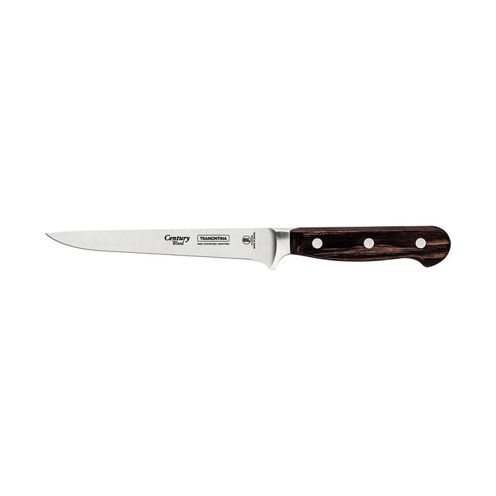 To guarantee a distinctive and incomparable kitchen experience, the Tramontina Century Wood 6-inch boning knife with stainless-steel blade and brown treated-wood handle is the ideal choice. Designed with a special forged stainless-steel blade, it is truly a culinary masterpiece, as it provides accurate cuts, perfect slices, and exceptional chopping performance. Its handle is treated wood fixed with stainless-steel rivets, and it confers handling comfort and safety, ensuring a solid grip. This convenient knife is dishwasher-safe, making cleaning easy and your kitchen routine much simpler, whether you are a professional or a food enthusiast. Get yours now and enjoy high cutting power and excellent edge durability, for preparing your dishes masterfully. Features • Real Ethically Sourced Timber • Dishwasher Safe – residential & commercial • Forged Blade • 25-year warranty against manufacturing defects • Made in Brazil What Am I Buying 1 x Boning Knife Materials Stainless Steel and Wood Dimensions 6inches/15cm