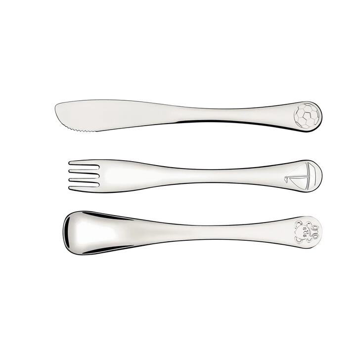 Tramontina Le Petit are a fine function collection of stainless-steel pieces with inspired childrens toys design. Entirely made in stainless steel these remain highly durable keeping the original features, preserving looks, hygiene and durability. The ergonomic shape and varying patterns were specially created to encourage and excite children to enjoy mealtime. With a shiny finish, they come with either a ball & boat or hearts and bows design allowing you to match your childrens preference. The pieces are safe for daily dishwasher use. Features • Dishwasher Safe • Shiny Finish • Stainless Steel • Ergonomic • Highly Durable What Am I Buying• 1 x Knife • 1 x Fork • 1 x Spoon Materials Stainless Steel