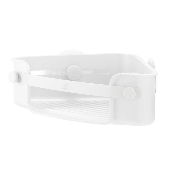 Flex Adhesive Corner Bin makes excellent use of the under-utilised corner space in your shower – giving you more room, while keeping all your essentials on hand. Easy to install, Flex Adhesive Corner Bin includes non-damaging, waterproof adhesive strips that can be applied on various non-porous surfaces such as tiles, dry wall, concrete, etc. Flex Adhesive Bin has space for shampoo, conditioner, body wash, a razor and two hooks for loofahs and wash cloths. Made from 85% recycled plastic. Features • NON-DAMAGING ADHESIVE INSTALLATION: Features a non-damaging adhesive backing which can be applied on various surfaces such as tiles, dry wall and concrete (please note: does not work on porous surfaces) • PROVIDES ELEVATED SHOWER STORAGE: Designed to organise shower essentials, this shower caddy has space for shampoo, conditioner, body wash, a razor, plus 2 hooks for hanging loofahs, washcloths and more • RUST-PROOF AND EASY TO CLEAN: The Flex has integrated drainage holes that allow water to drain out of the caddy, helping it stay clean and dry. What Am I Buying 1 x Bathroom storage container Materials Recycled ABS/PET/Polycarbonate