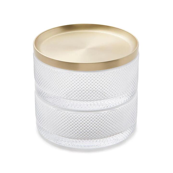 Featuring two tiers that can be stacked or separated, this jewellery box is the perfect addition to help store and organise your accessory collection. The Tesoras plated metal lid doubles as a tray to store and display easily accessible accessories. Its two-tiered stacking design makes this a versatile storage solution that can be stacked on top of one another to save room or kept separately. Its perfect size makes it easy to place by your bedside table for easy access and to ensure your jewellery does not get lost. Features • Tesora's modern design makes it perfect to display on your dressing table, bedside table or counter without comprising style. • Have fun – stack them, separate them, or place the bowls side-by-side. The Tesora Jewellery Box is a fun and versatile way to keep your favourite jewellery, including rings, bracelets and any other accessories, safe and organised. • Tesoras lid is made from plated metal and doubles as a display tray for easy access to your everyday accessories. What Am I Buying 1 x Jewellery box Materials Zinc/Felt/EVA/Glass