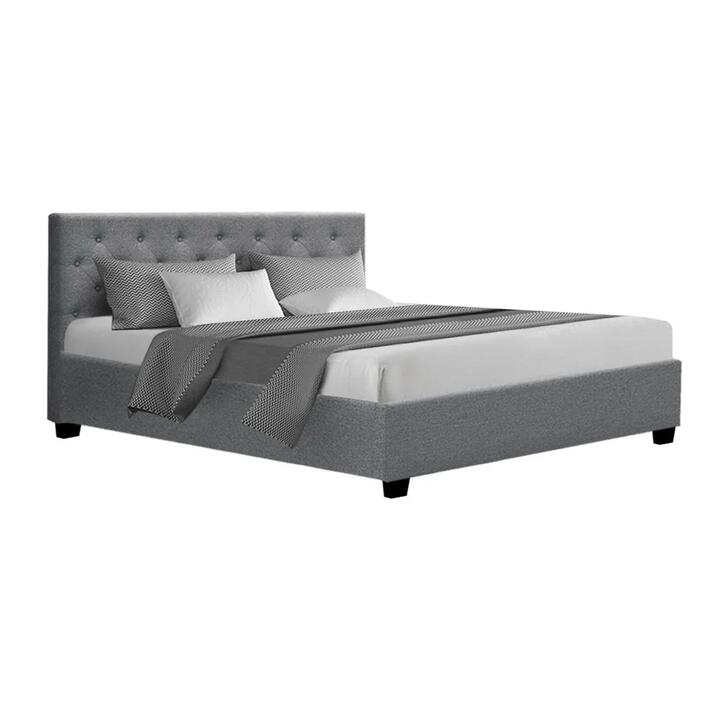It is time to upgrade and sleep like royalty in our Artiss Vila bed frame. Draped in a faux linen fabric, and with a grandiose tufted headboard; you will enjoy retiring to your boudoir and going to sleep each night. But there is a more to this luxurious bed frame than meets the eye! Lift the frame by pulling a strap and you will see a hidden storage space under the wooden arched slat base. The gas lift system enables you to effortlessly lift the bed to store all the items you wish to hide away, and it is perfect for storing seasonal clothes or extra bedding. The wooden arched slat base is also designed to flex appropriately so that it can better distribute the weight on it and helps to minimise movement disturbances within the night created when two people are sleeping The bed frame is well-built with reinforced steel bars within its sturdy steel frame. Heavy-duty metal connectors keep the frame sturdy with additional central support from an adjustable centre support beam, so you can rest easy at night knowing you have great support. Note: Mattress is sold separately Features: Premium faux linen fabric Padded with high density foam Tufted headboard Breathable non-woven fabric Gas lift storage system Sturdy steel frame Wooden arched slat base Heavy duty metal connectors Reinforced construction with steel bars Adjustable centre support beam Specifications: Frame: Steel Slats: Wood Exterior: Faux linen fabric Bed head height: 99cm Storage height: 33.5cm Queen frame dimension: 215.5 x 160 x 99cm Fits standard Australian Queen size mattress: 153 x 203cm Colour: Grey Package Contents: 1 x Bed Frame 1 x Assembly Manual. Note:- Actual product colours may vary due to lighting, studio photography, room conditions, different screens on various devices. – All our furniture product are flat pack (assembly required) for safe handling purposes.