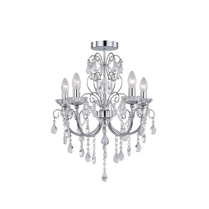 Elegantly liven up your home with this brilliant Shirina Walker 5-Light Chandelier Light. The crystal drops add a hint of prestige, with the ornate chrome detailing offering a true feature for any home design. Chandeliers help you make a statement about your love of style and luxury, filling your space with a talking point for anyone who gazes upwards. Features, Frame is made from metal for strength and durability, Features a slender arm, rise in a gentle curve, Gracefully adorned with polished crystal beads, Suspension chain leads to a metal ceiling canopy, Offering ample light from its 5-bulb capacity, Bulb Fitting: E14, 40W Max, not included, Dimensions, W 49 x D 49 x H 59 cm, Dispatch Timing, Normally dispatched within 3 business days, Notes, This item comes with 12-Months Manufacturer Warranty. Note:- Actual product colours may vary due to lighting, studio photography, room conditions, different screens on various devices.