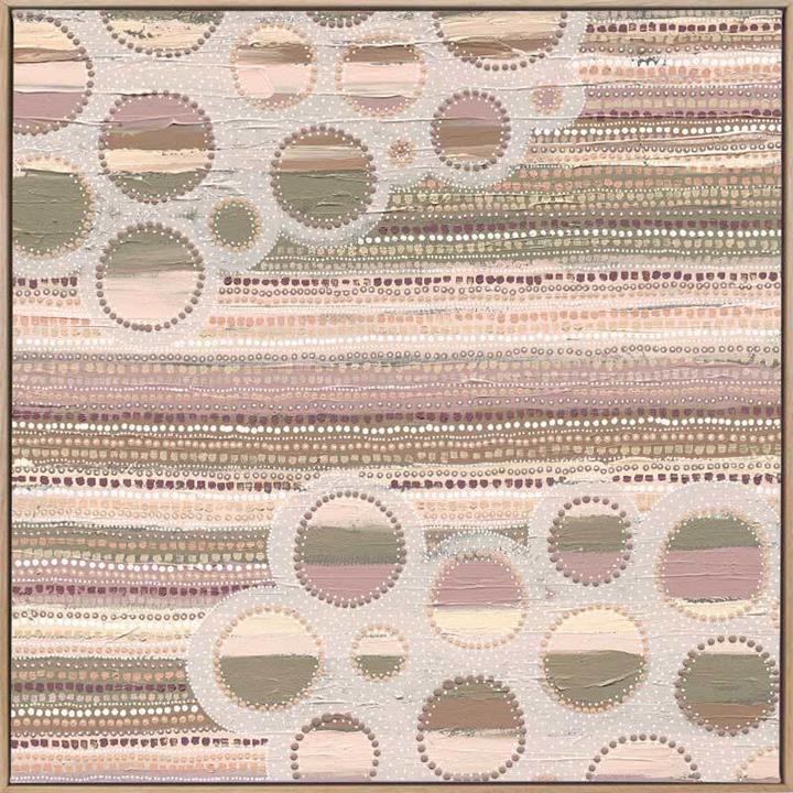 Wiradyuri Yiramiilan Purple Canvas Art Print – With a distinctive, muted colour palette of pink and purple undertones, this Indigenous Aboriginal artwork uses traditional dot painting for a uniform look and feel. Horizontal lines are broken up by lighter coloured holes, giving an effect of movement, like clouds passing through a rainy sky. A versatile piece for any room. Represented within this piece is a Wiradyuri sunrise on the bank of the Murrumbidgee River- the river running through my Country, and one of my most cherished places. It reflects the swiftness of the water, moving quickly yet calmly downstream towards the Wiradyuri reserve. The droplets of water falling from my face and hair upon a morning swim, managing still to reflect the soft hues as the sky takes her colour for the day, warmed and filled by Grandmother Sun. Urban Road is committed to investing a stream of ongoing financial support back to our artist community. For every artwork sold, a percentage of the sale price goes directly back to the artist. Disclaimer: Colours of Urban Road products may vary due to device display differences, monitor settings, inherent product variations, lighting conditions, and screen calibration. While we strive for accuracy, slight variations may occur. For any concerns, contact our customer support. Your satisfaction is our priority. STRETCHED CANVAS Urban Road's stretched canvas fine art prints are professionally printed on polycotton artist canvas, using archival inks and then stretched and gallery wrapped. This means the image is stretched around a 38mm frame to create a seamless, museum-quality finish. All stretched and box framed art prints arrive ready to hang. SHADOW BOX FRAMES We also offer the option to add a shadow box frame to your Urban Road canvas art print. A little different from a traditional framed print, the canvas sits within the box frame with a 5mm gap, creating a sophisticated shadow effect between the frame and the canvas. Our solid timber box frame mouldings are 10mm wide, and 55mm deep, and add approximately 40mm to the length and height of the listed canvas size. ROLLED CANVAS ART At Urban Road, we also offer you the option to purchase your canvas art print unframed to allow you to have it framed your own way. As with our stretched and box framed canvas products, our rolled canvas prints are professionally printed on durable, museum-quality, matte coated polycotton canvas and made to order. Our rolled canvas products are printed to the listed stretched size, and come with an additional 45mm mirrored edge plus another 60mm white border to allow for gallery wrapping.