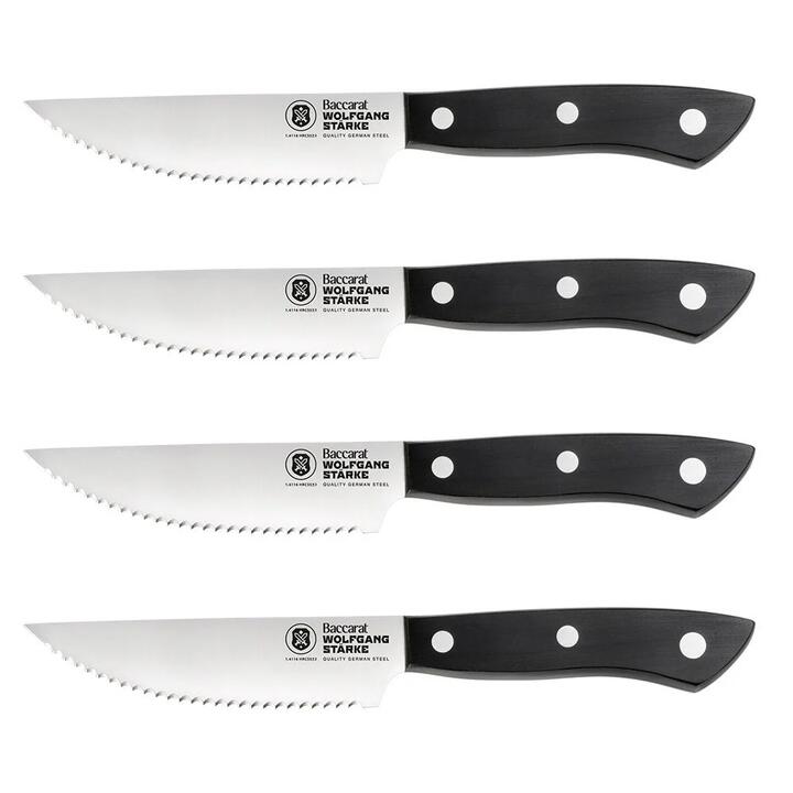 The Performance of the Baccarat WOLFGANG STARKE 4 Piece Steak Knife Set makes it a #1 essential for any kitchen. The best meals deserve the best equipment. These knives feature razor sharp serrated edges for cutting through meat without crushing or tearing. Enjoy delicious roast dinners, steak nights and other meat dishes. BRAND CREDENTIALSWOLFGANG STARKE brings German precision and blade-smith perfection to Baccarat. The choice of the great European Master Chef's can be yours at home too. Celebrated for perfection in manufacturing and cutting performance, the WOLFGANG STARKE range is constructed from high-quality German stainless steel, and produced with a controlled tempered process to ensure the best possible hardness, toughness and flexibility. Features • The Baccarat WOLFGANG STARKE 4-piece knife set includes sleek steak knives with perfectly balanced 11.5cm serrated blades crafted from quality German steel• Forged to produce perfect control, weight and balance with durable polymer handles for a comfortable grip• Each Baccarat WOLFGANG STARKE knife is hardened to ensure the sharpness of the blade and then tempered to enhance the strength• Backed by the Baccarat LIFETIME GUARANTEE Dimensions Blades: 11.5cm Material German Steel