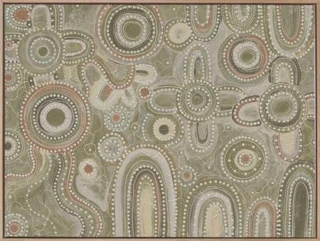 Yinaagang Green Canvas Art Print – Mesmerising in all its shapes and colours, this Aboriginal art piece by Wiradjuri artist, Amanda Hinkelmann, brings a dynamic, yet calming energy to any space. Overlapping round shapes and swirling lines are brought to life with traditional Indigenous dot painting, while a muted palette of khaki green and hints of warm brown evokes a relaxing vibe. This artwork depicts the journey from childhood to womanhood, highlighting growth and learning through teenage years, with optimism for the future. It portrays the groups of people encountered and the many crossroads that steer your destiny. Urban Road is committed to investing a stream of ongoing financial support back to our artist community. For every artwork sold, a percentage of the sale price goes directly back to the artist. This versatile collection of Indigenous art by renowned Wiradjuri artist, Amanda Hinkelmann, features an expressive neutral palette in multiple colourways, including muted brown, blue, green, and pink tones. Perfect for celebrating NAIDOC Week 2024, these Aboriginal art pieces bring warmth, comfort, and a touch of elegance to your space. Support First Nations art and let your walls tell stories rich in culture and heritage.