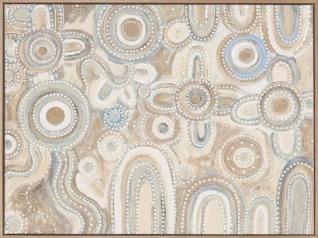 Yinaagang Neutral Canvas Art Print – Mesmerising in all its shapes and colours, this Aboriginal art piece by Wiradjuri artist, Amanda Hinkelmann, brings a dynamic, yet calming energy to any space. Overlapping round shapes and swirling lines are brought to life with traditional Indigenous dot painting, while a neutral palette of various beige tones evokes a sense of serenity. This artwork depicts the journey from childhood to womanhood, highlighting growth and learning through teenage years, with optimism for the future. It portrays the groups of people encountered and the many crossroads that steer your destiny. Urban Road is committed to investing a stream of ongoing financial support back to our artist community. For every artwork sold, a percentage of the sale price goes directly back to the artist. This versatile collection of Indigenous art by renowned Wiradjuri artist, Amanda Hinkelmann, features an expressive neutral palette in multiple colourways, including muted brown, blue, green, and pink tones. Perfect for celebrating NAIDOC Week 2024, these Aboriginal art pieces bring warmth, comfort, and a touch of elegance to your space. Support First Nations art and let your walls tell stories rich in culture and heritage.